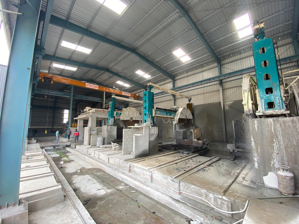 • The large blocks of stones, extracted from our quarries are sliced into smaller pieces through giant gang saws. The slabs then get polished on one side and bundled together with similar-sized ones from the same piece, before being loaded onto containers for transport to factories.